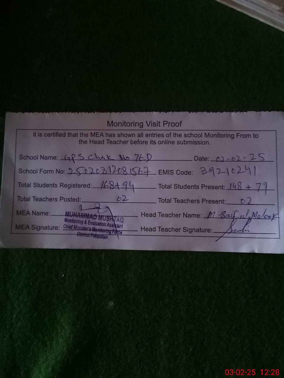 | EMIS Code: 39210241 | Name of School: GPS CHAK NO. 76/D | |||