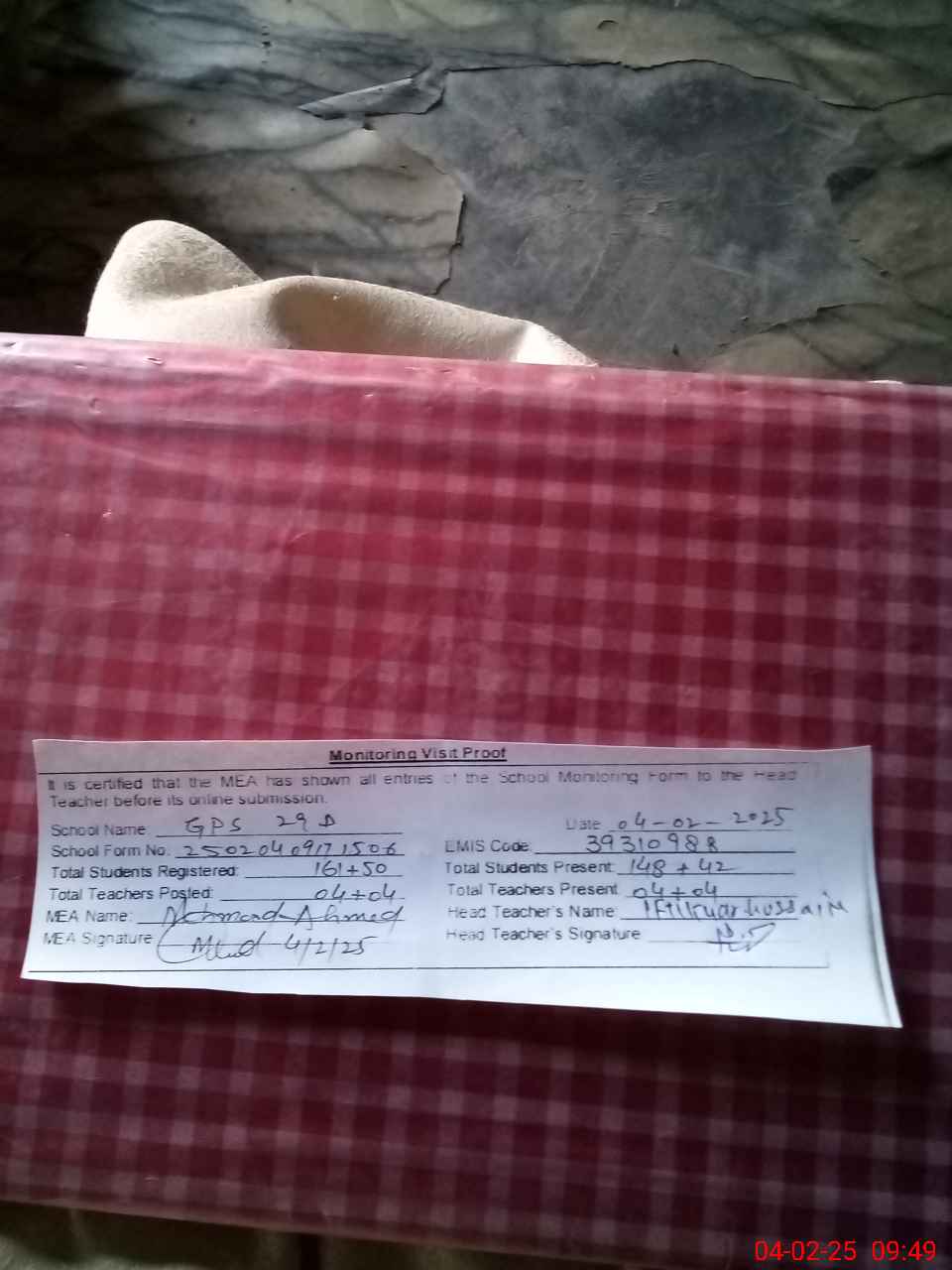 | Attendance Register | Head Teacher | MEA with School | Visit Proof |