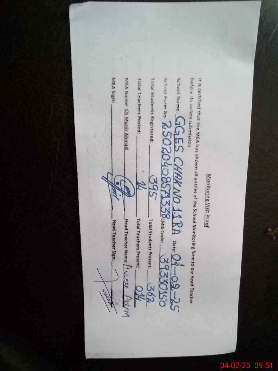 | EMIS Code: 39330150 | Name of School: GGHS 1/1-RA RENALA KHURD | |||
