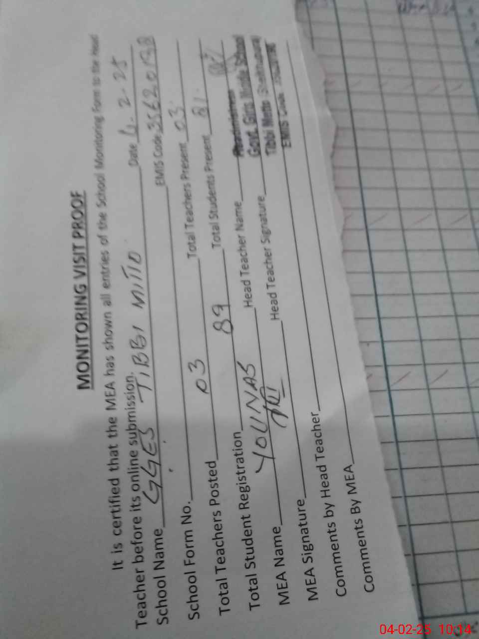 | Attendance Register | Head Teacher | MEA with School | Visit Proof |