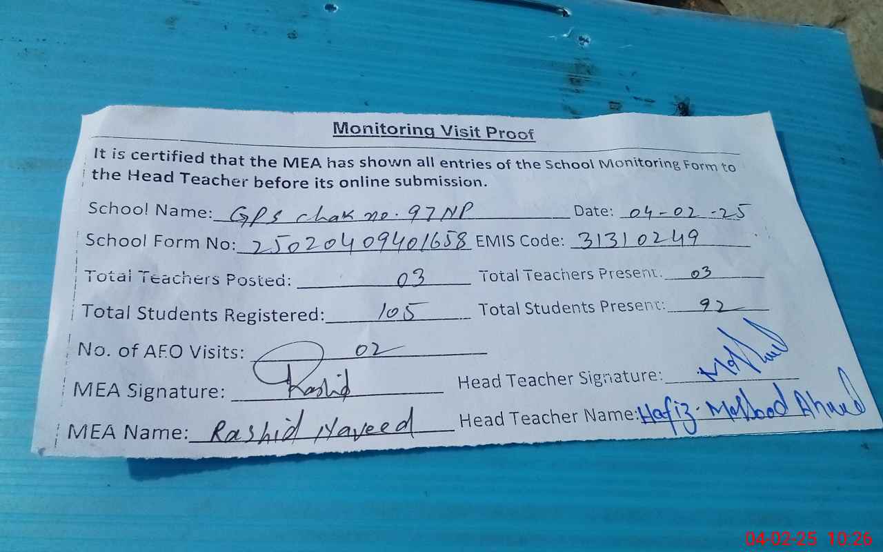 | EMIS Code: 31310249 | Name of School: GPS CHAK NO. 97/NP | |||