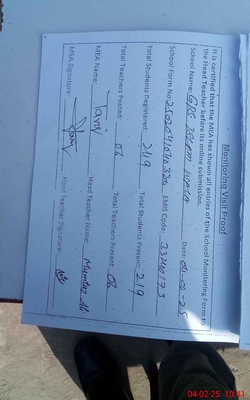| EMIS Code: 33240173 | Name of School: GPS ISLAM WALA | |||