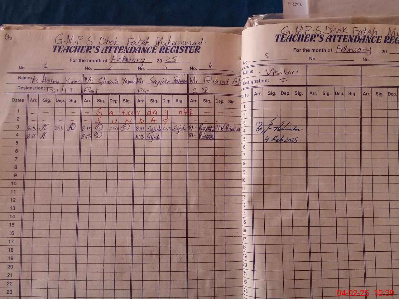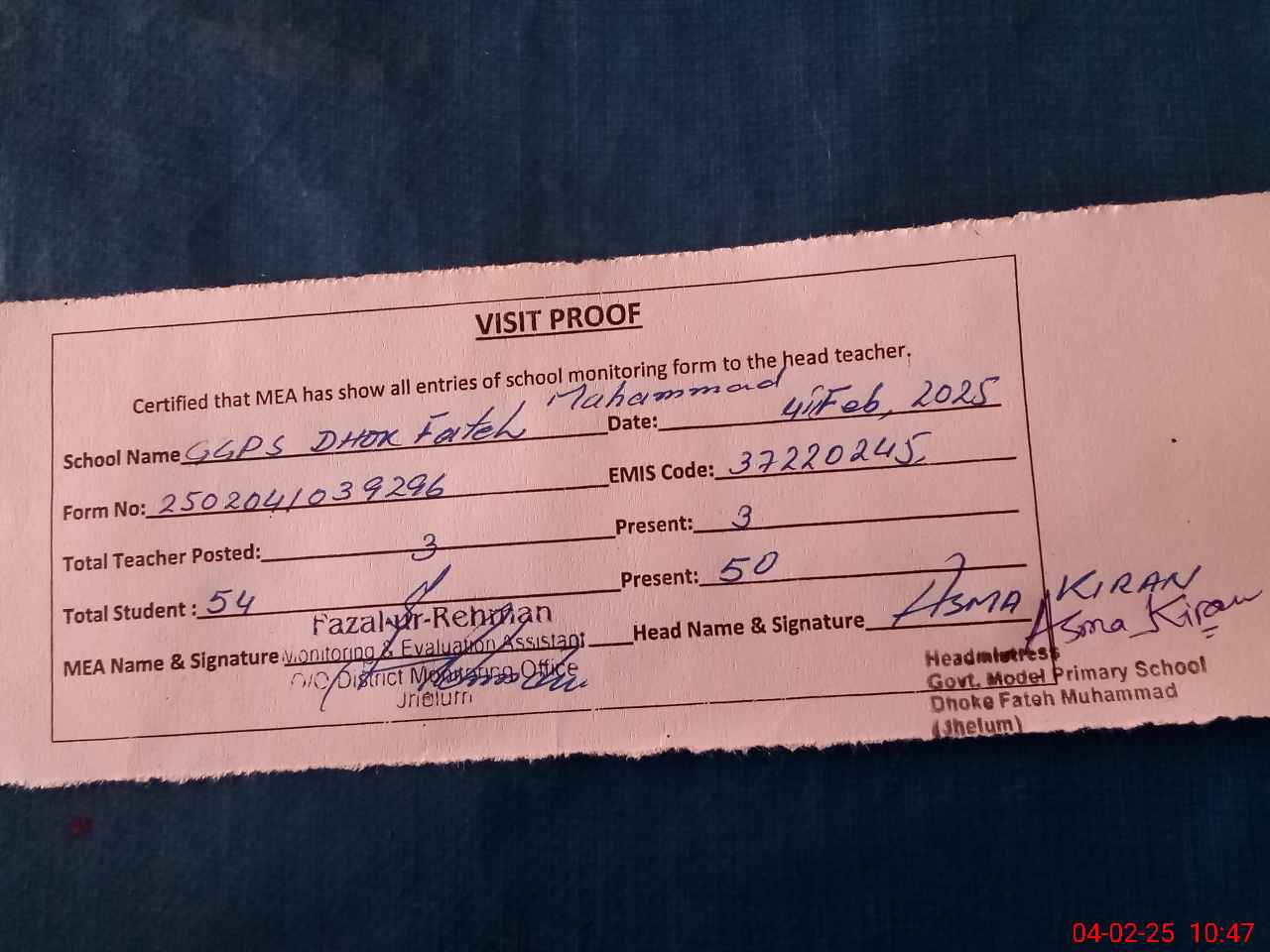 | Attendance Register | Head Teacher | MEA with School | Visit Proof |
