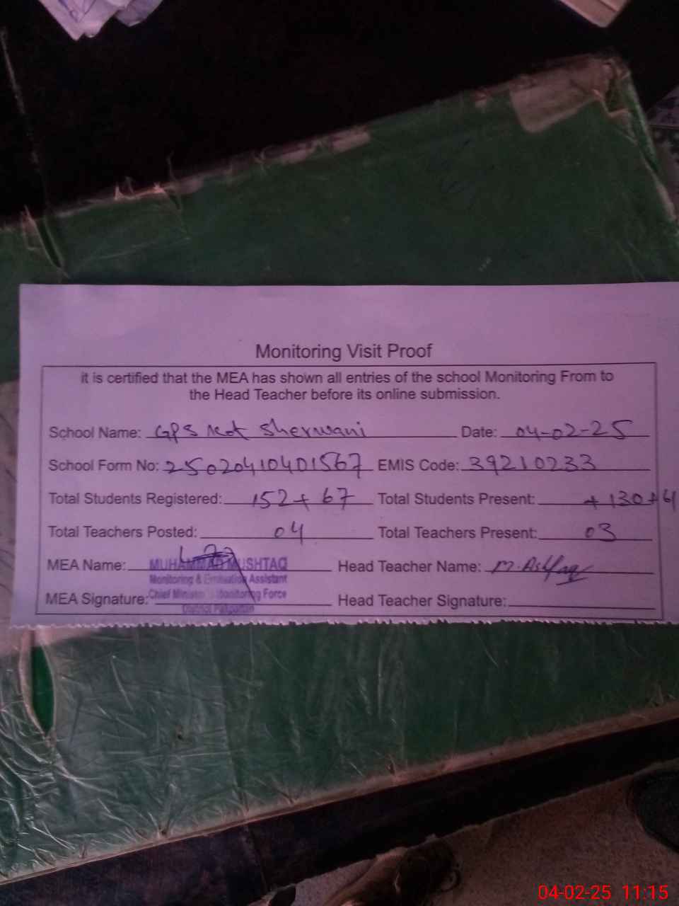 | Attendance Register | Head Teacher | MEA with School | Visit Proof |