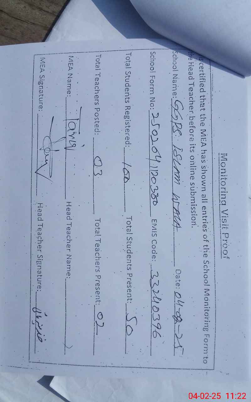 | EMIS Code: 33240396 | Name of School: GGPS ISLAM WALA | |||