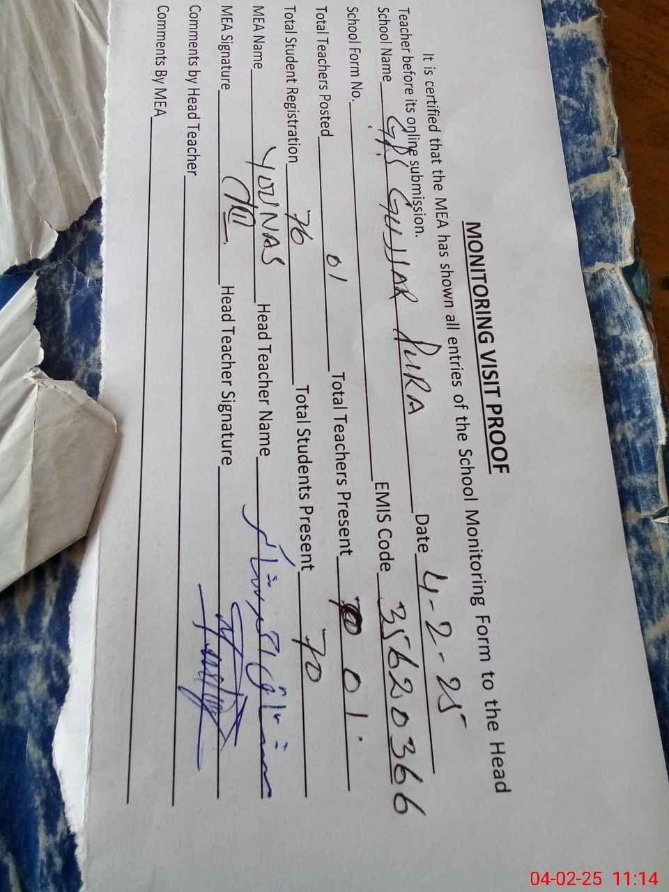 | Attendance Register | Head Teacher | MEA with School | Visit Proof |