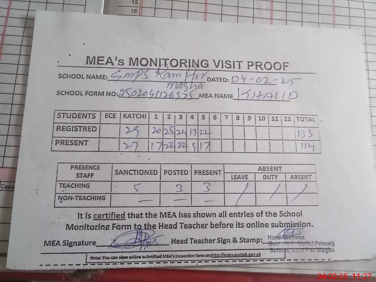 | EMIS Code: 36430399 | Name of School: GMPS RAM PUR MAGHA, TULAMBA | |||