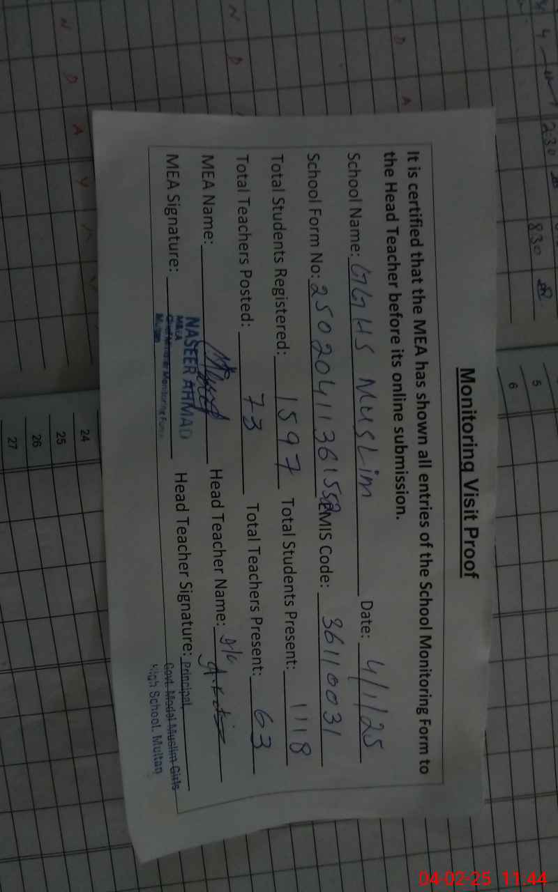| EMIS Code: 36110031 | Name of School: GGHS MUSLIM PUL MOJ DARYA | |||