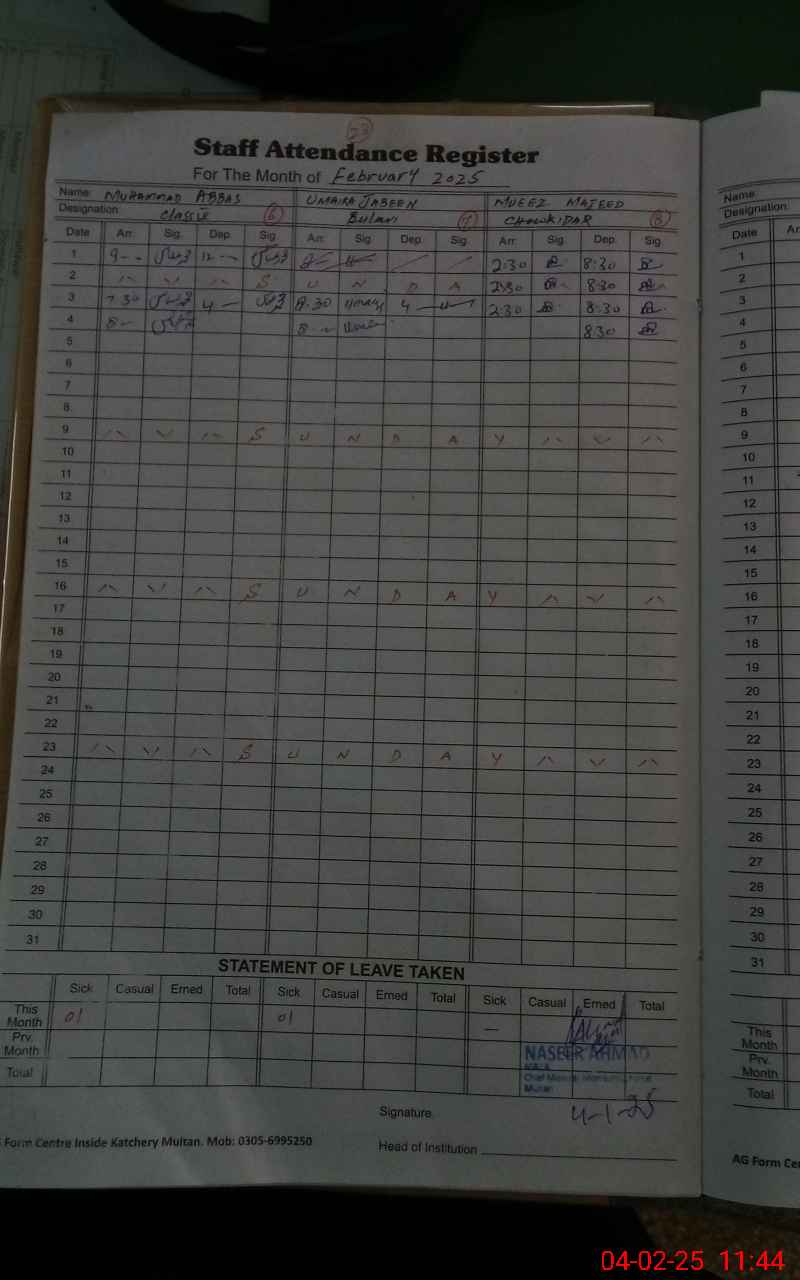 | CNIC | Full Name | Designation | R/C | Absence During Last Calender Month |