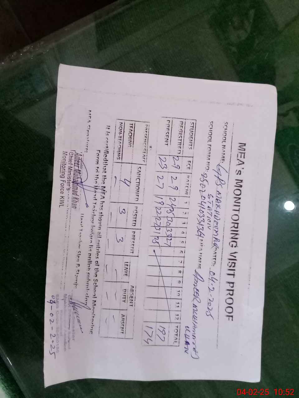 | Attendance Register | Head Teacher | MEA with School | Visit Proof |