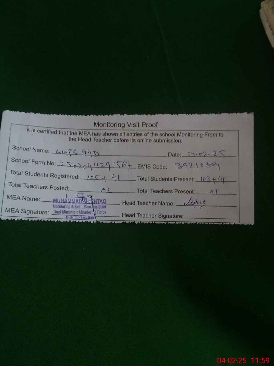 | Attendance Register | Head Teacher | MEA with School | Visit Proof |