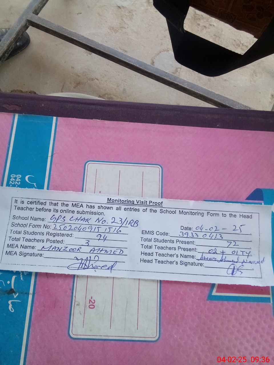 | EMIS Code: 39330413 | Name of School: GPS CHAK NO. 23/1-RB | |||