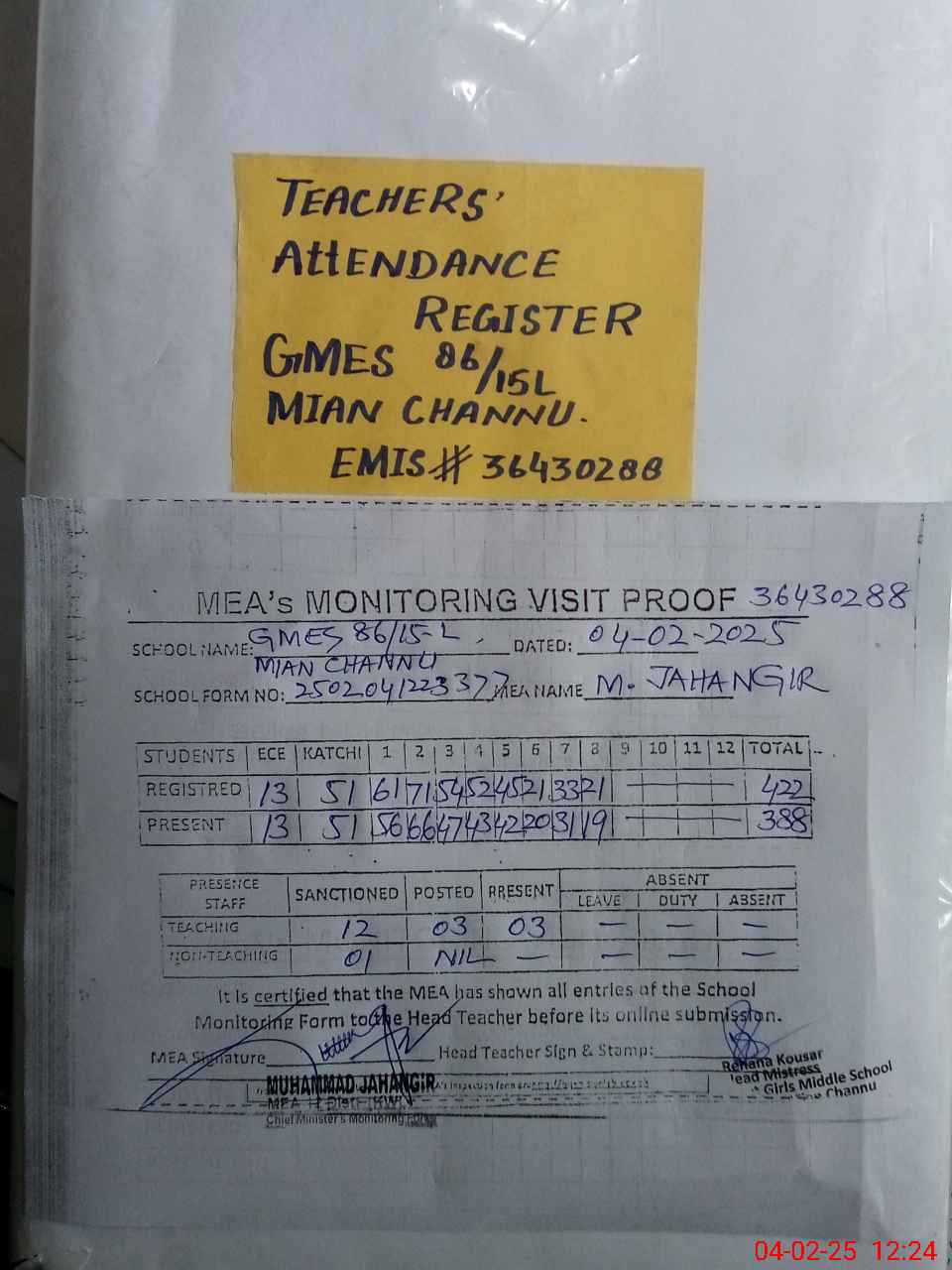 | Attendance Register | Head Teacher | MEA with School | Visit Proof |