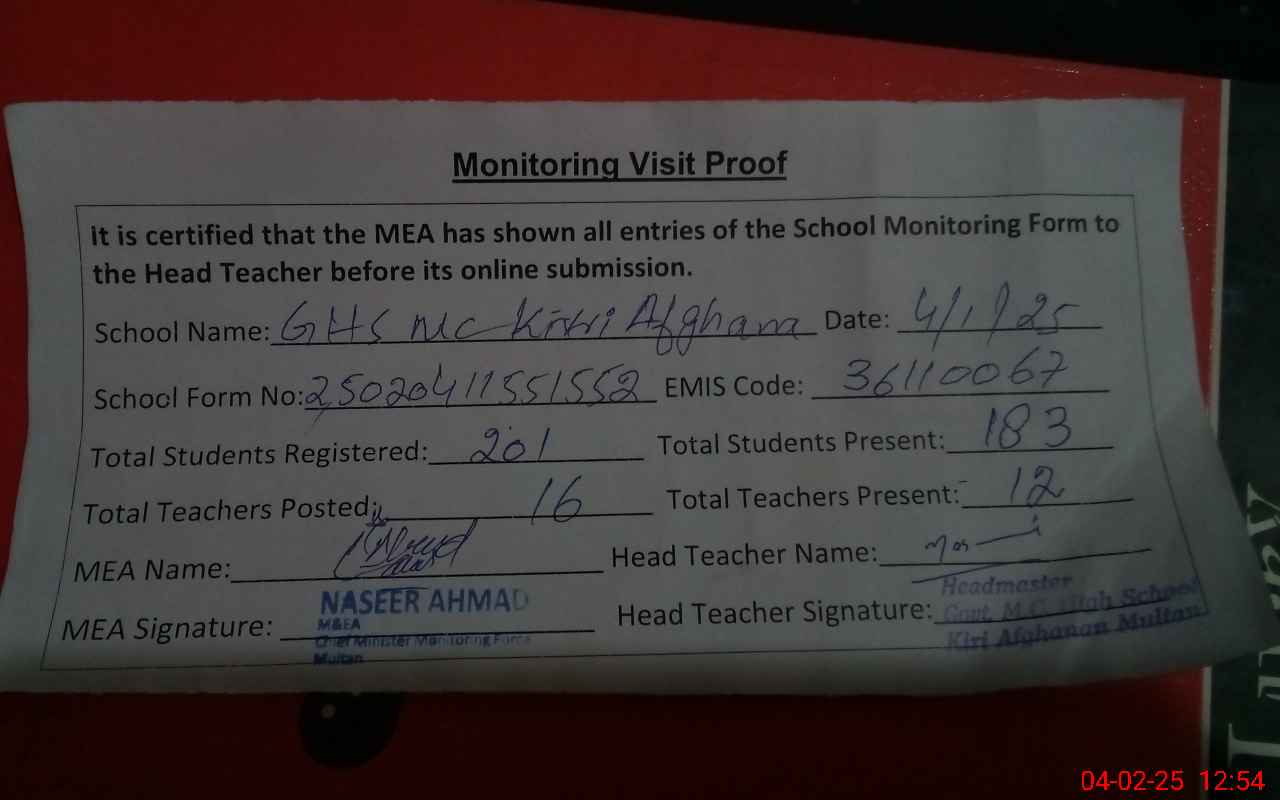 | EMIS Code: 36110067 | Name of School: GHS MC KIRRI AFGHANAN MULTAN | |||