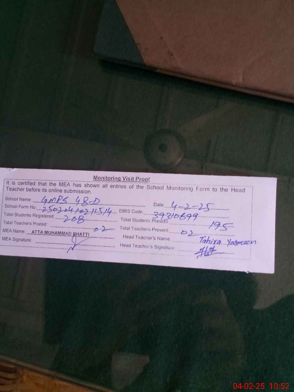 | Certified that this School was Inspected by the Undersigned MEA/DMO Today and the Information Stated Above is as Per Record. | |||||