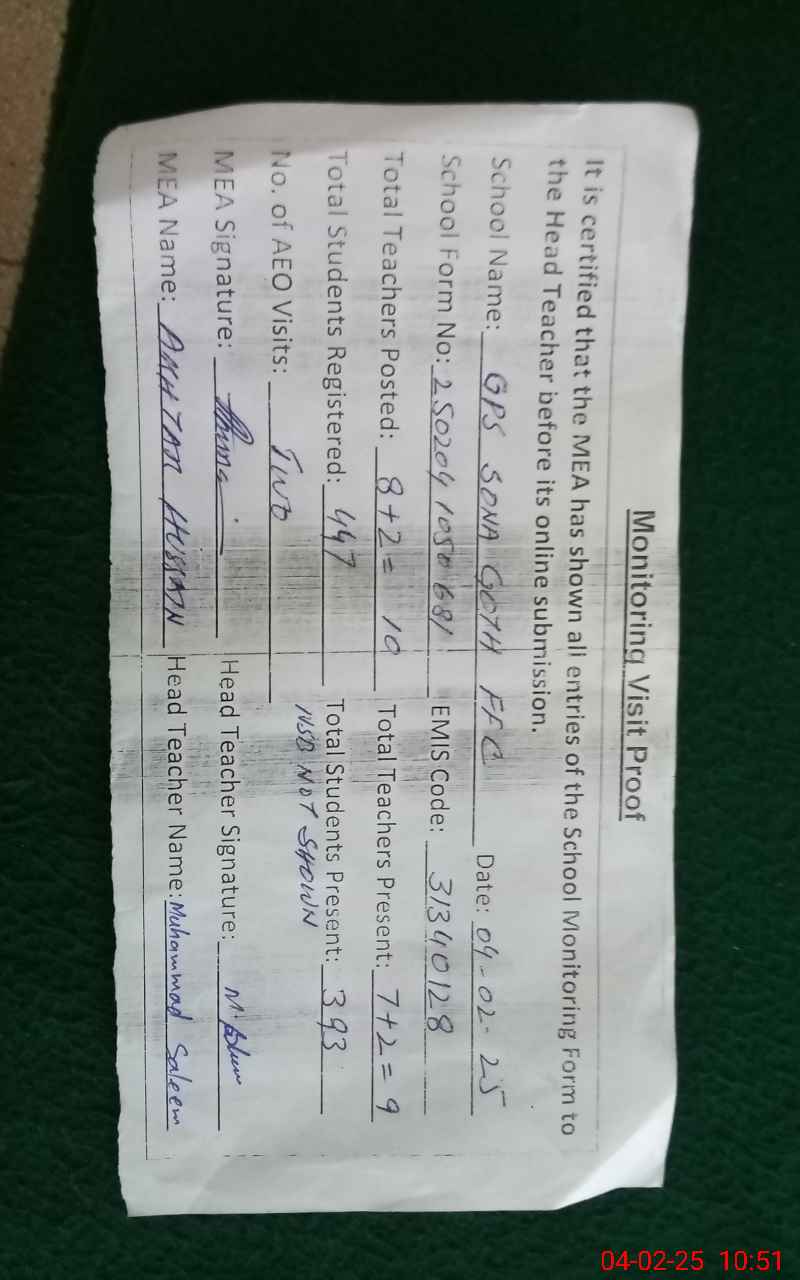 | EMIS Code: 31340128 | Name of School: GPS SONA GOTH FFC | |||