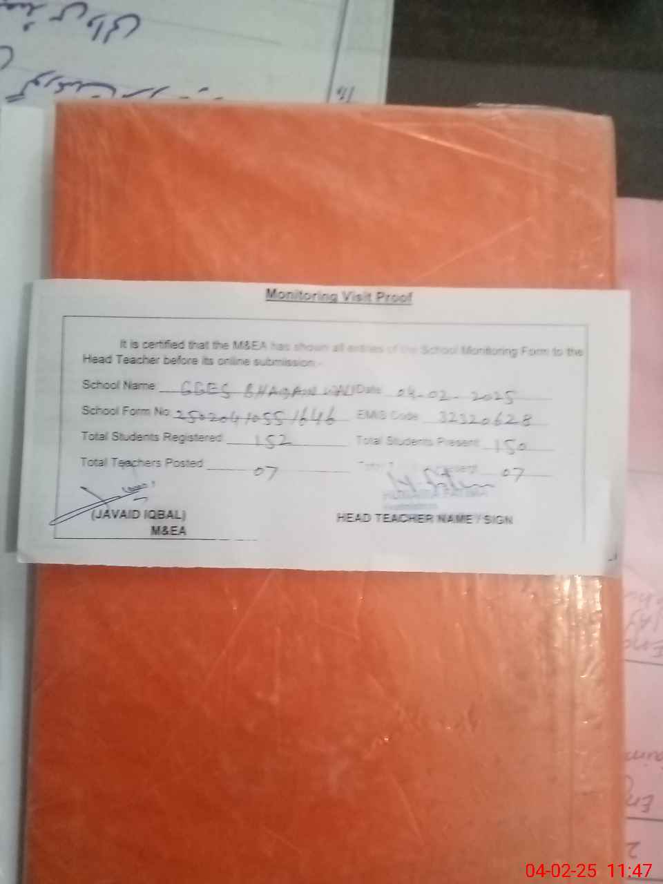 | Attendance Register | Head Teacher | MEA with School | Visit Proof |