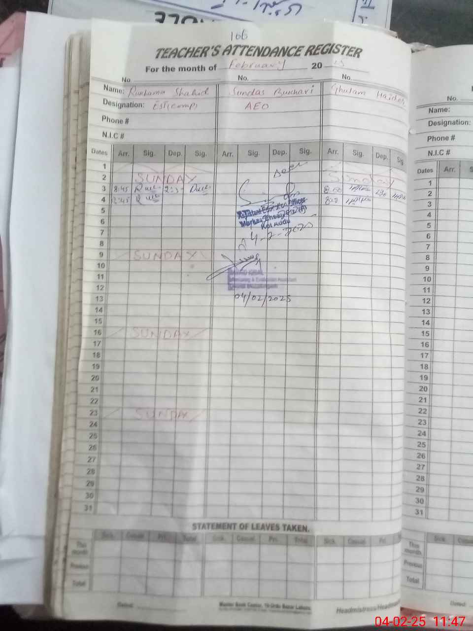 | CNIC | Full Name | Designation | R/C | Absence During Last Calender Month |