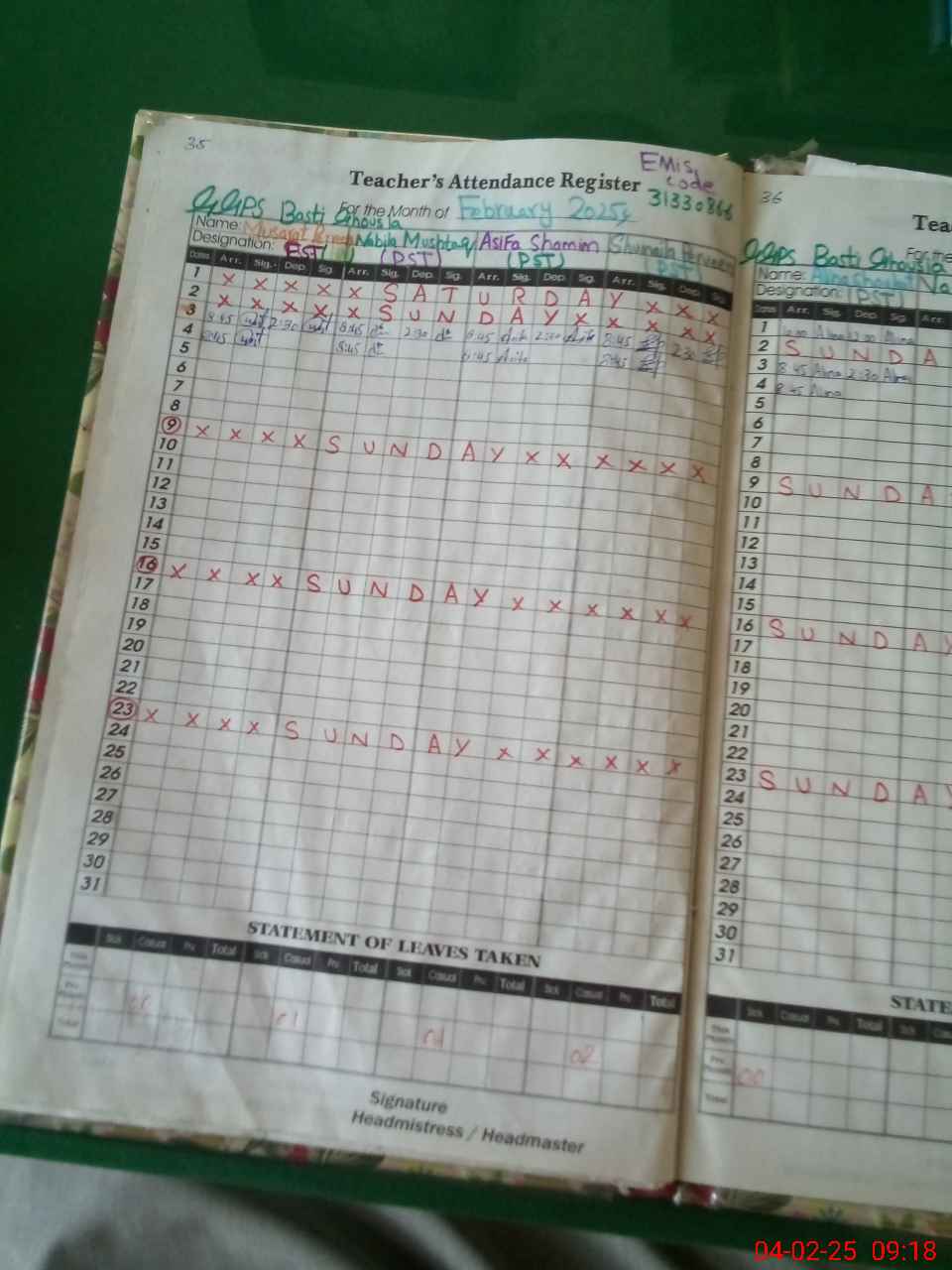 | Attendance Register | Head Teacher | MEA with School | Visit Proof |