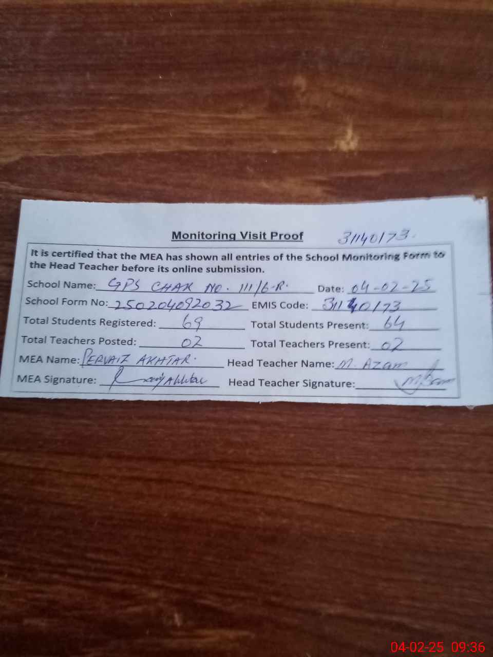 | EMIS Code: 31140173 | Name of School: GPS CHAK NO 111/6-R | |||