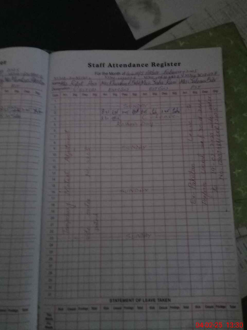 | Leave | Duty | Absent | Maternity | Medical | Ex- Pak |