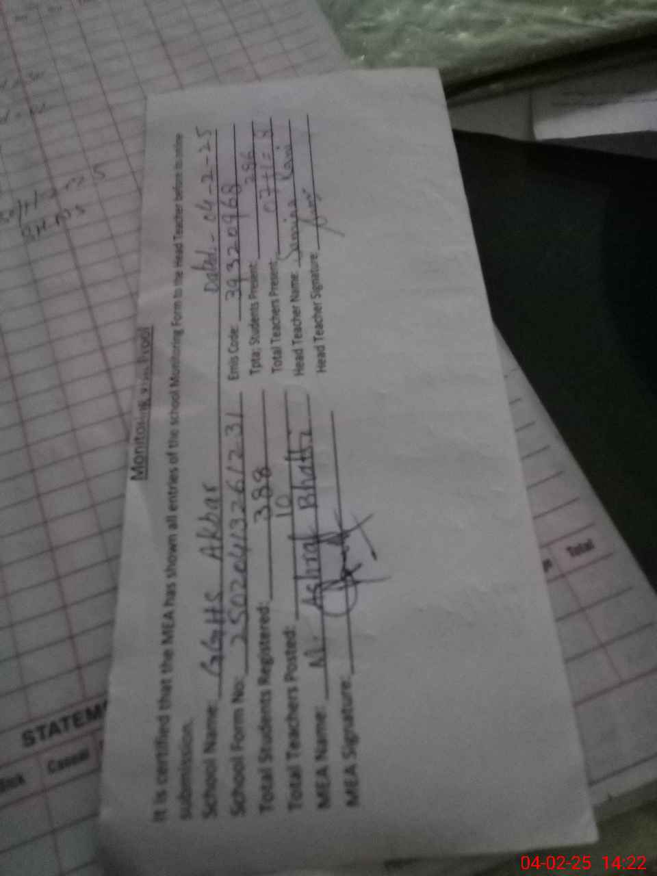 | Attendance Register | Head Teacher | MEA with School | Visit Proof |