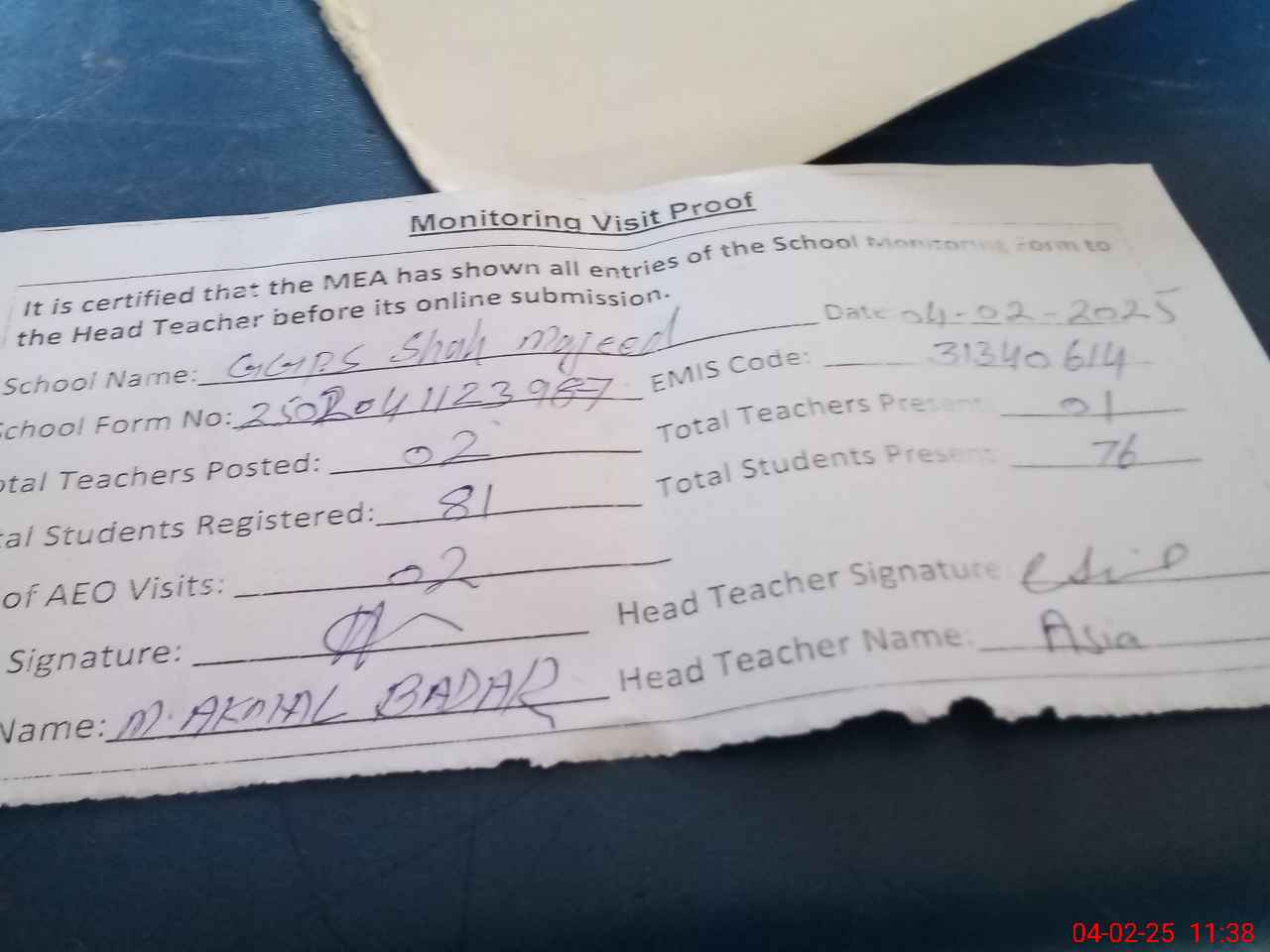 | Attendance Register | Head Teacher | MEA with School | Visit Proof |