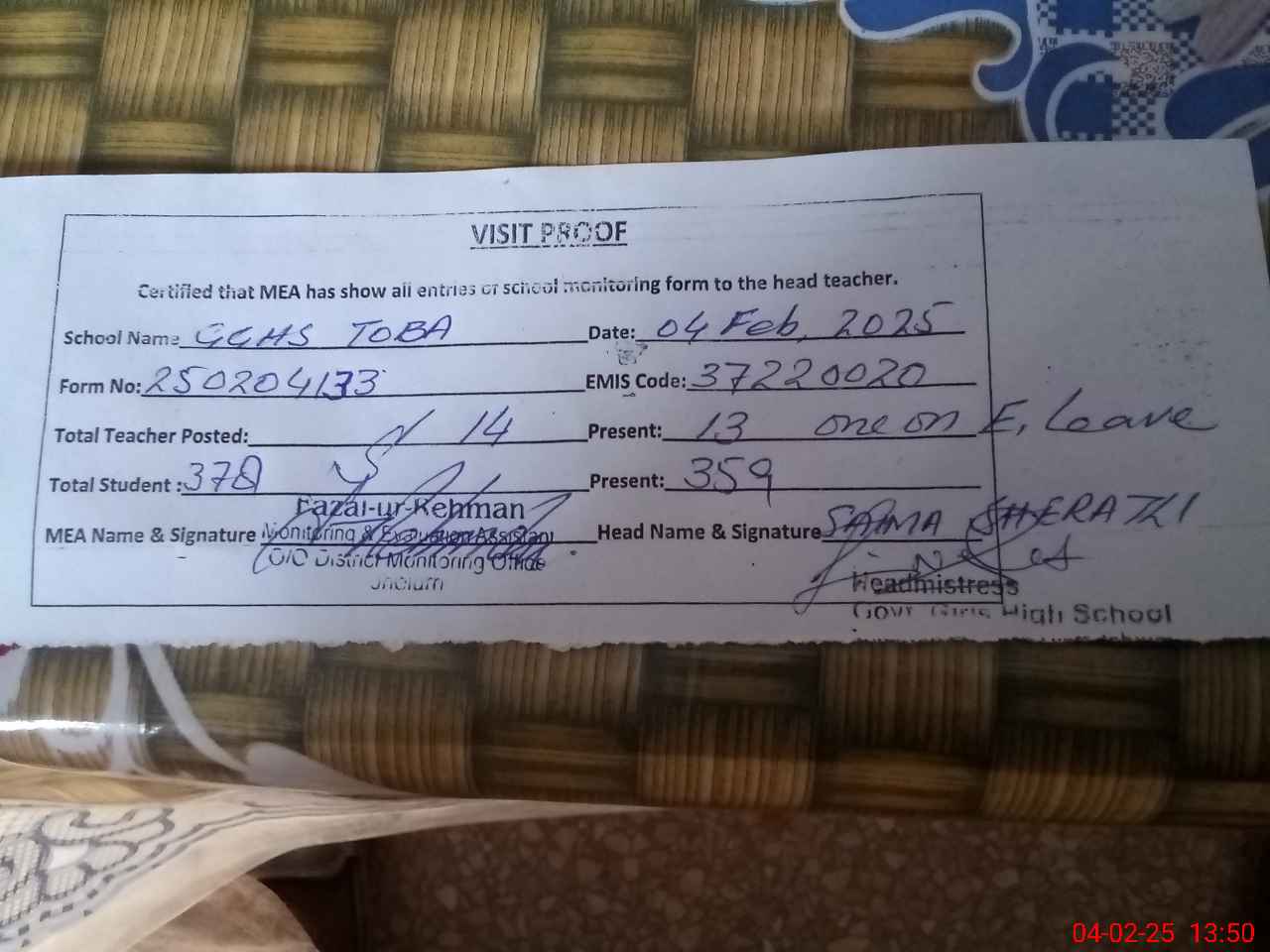 | Attendance Register | Head Teacher | MEA with School | Visit Proof |