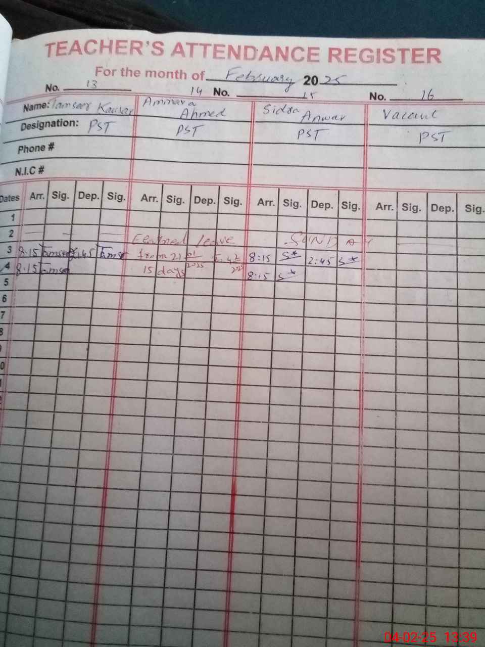 | CNIC | Full Name | Designation | R/C | Absence During Last Calender Month |