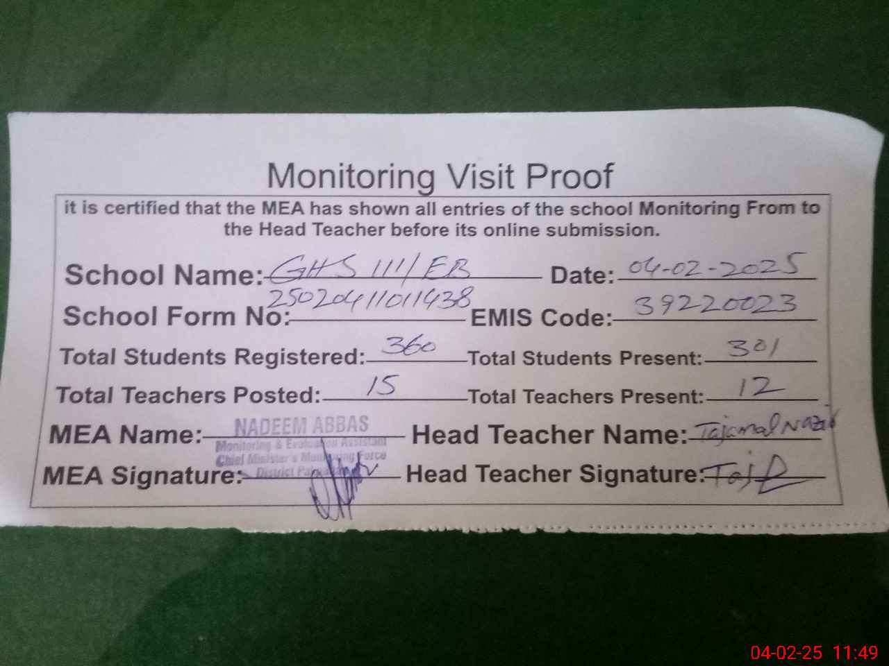 | Attendance Register | Head Teacher | MEA with School | Visit Proof |