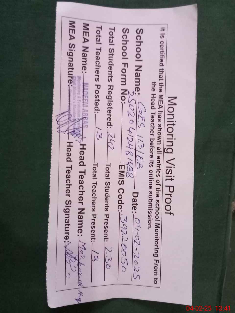 | EMIS Code: 39220050 | Name of School: GES 113 EB P/O 111 EB ARIFWALA | |||