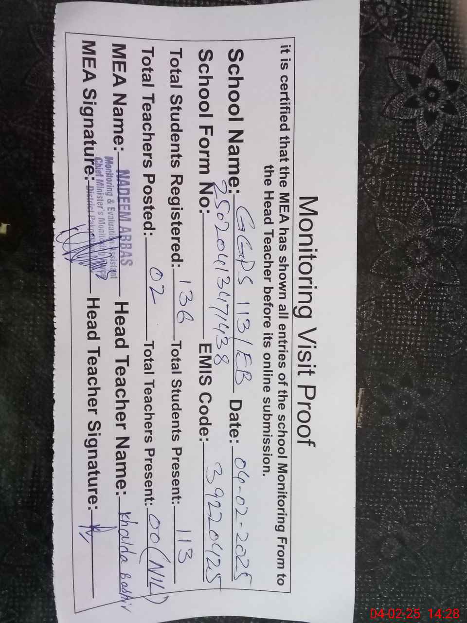 | EMIS Code: 39220425 | Name of School: GGPS 113 EB | |||