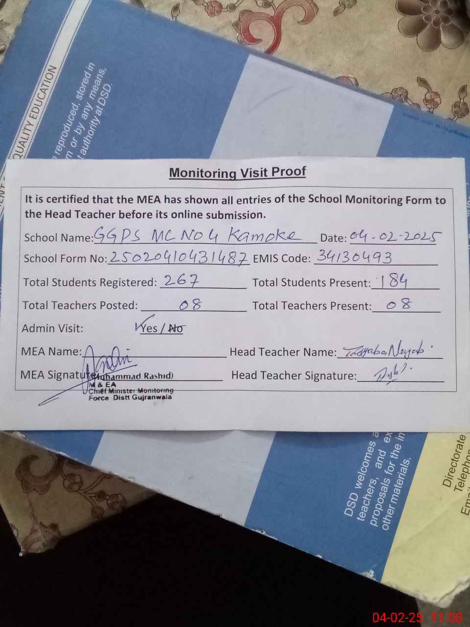 | EMIS Code: 34130493 | Name of School: GGPS MC NO.04 KAMOKE | |||