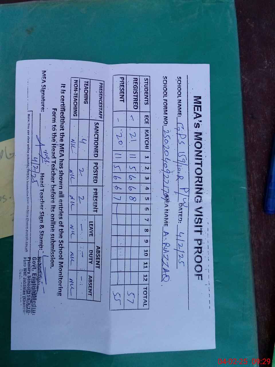 | Attendance Register | Head Teacher | MEA with School | Visit Proof |