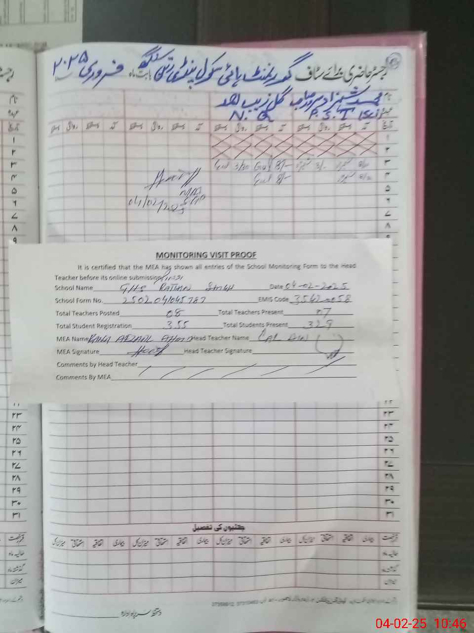 | Attendance Register | Head Teacher | MEA with School | Visit Proof |