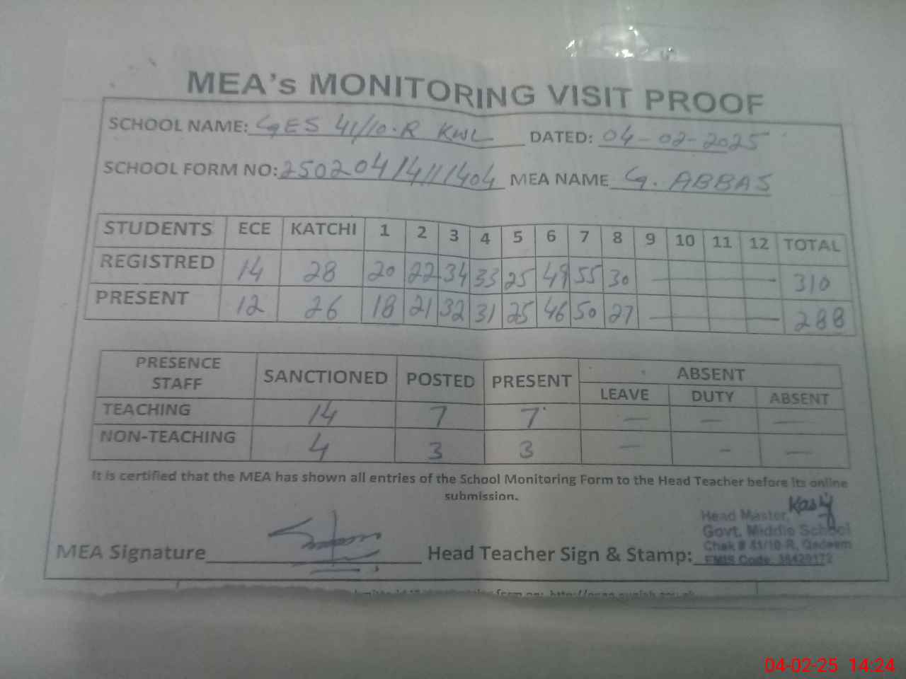 | EMIS Code: 36420172 | Name of School: GES 41/10-R QADEEM, KHANEWAL | |||