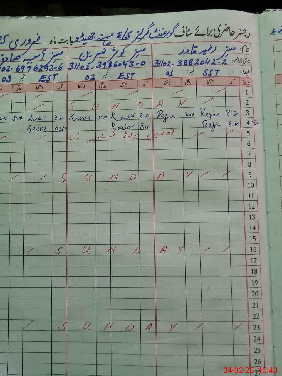 | CNIC | Full Name | Designation | R/C | Absence During Last Calender Month |