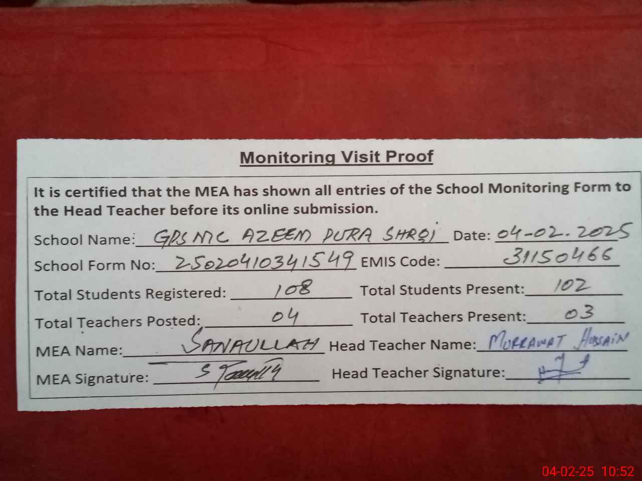 | EMIS Code: 31150466 | Name of School: GPS MC AZAM PURA SHARQI | |||