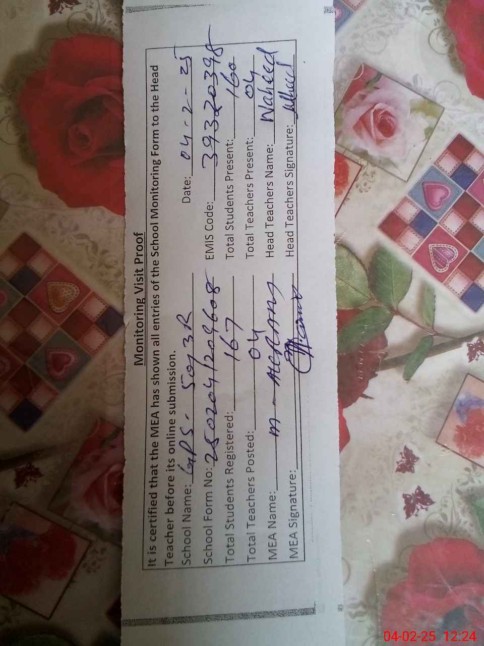 | Attendance Register | Head Teacher | MEA with School | Visit Proof |