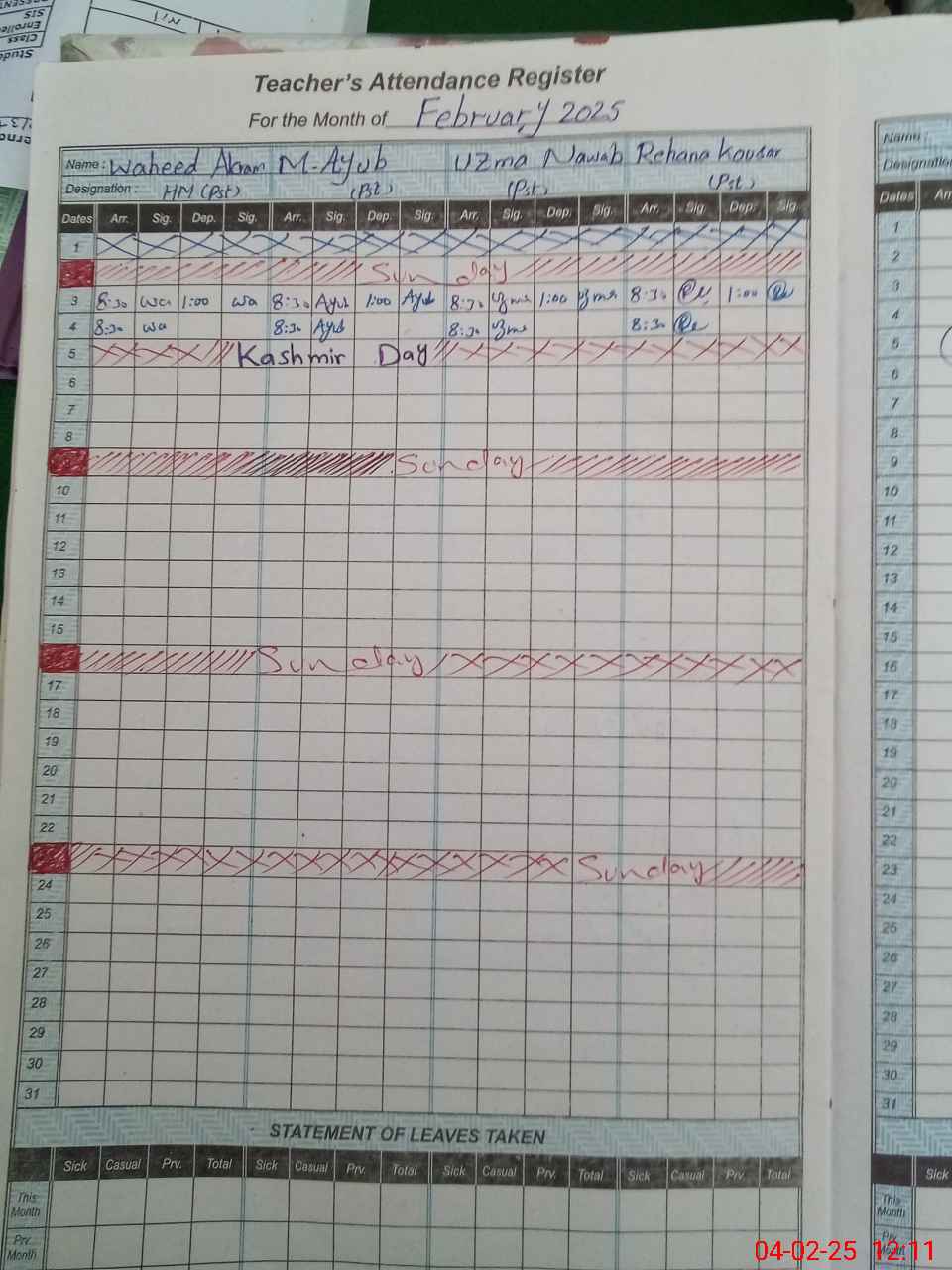 | Leave | Duty | Absent | Maternity | Medical | Ex- Pak |