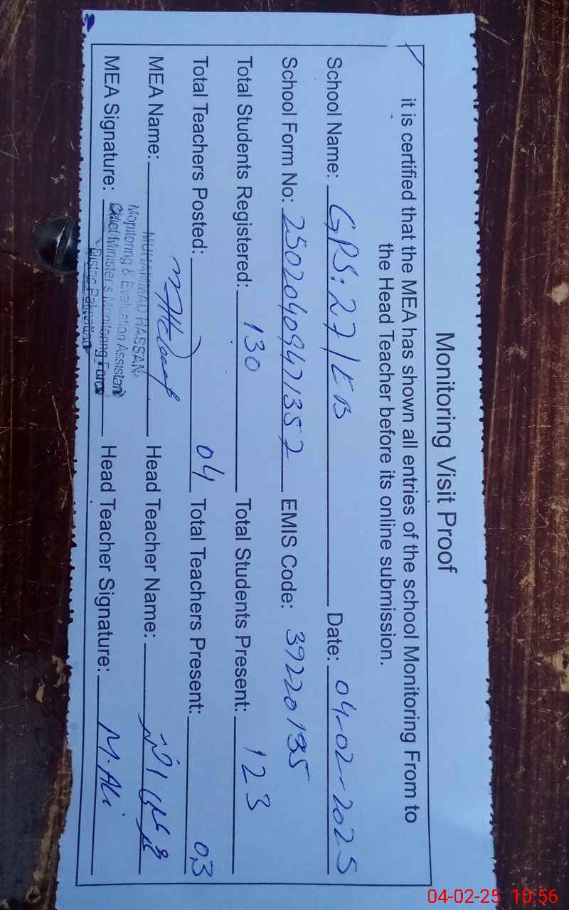 | EMIS Code: 39220135 | Name of School: GPS CHAK NO. 27 KB P.O QABOOLA | |||