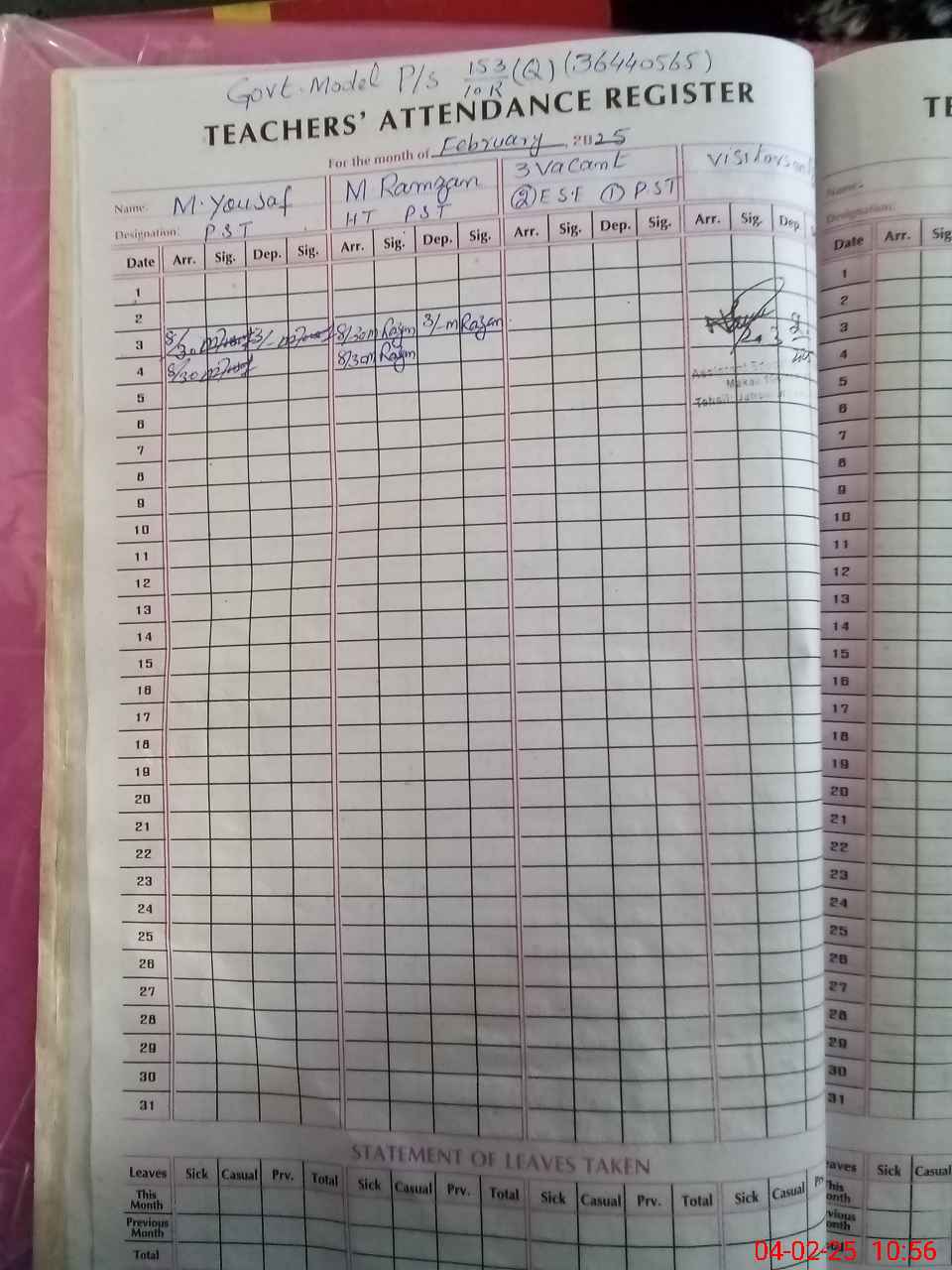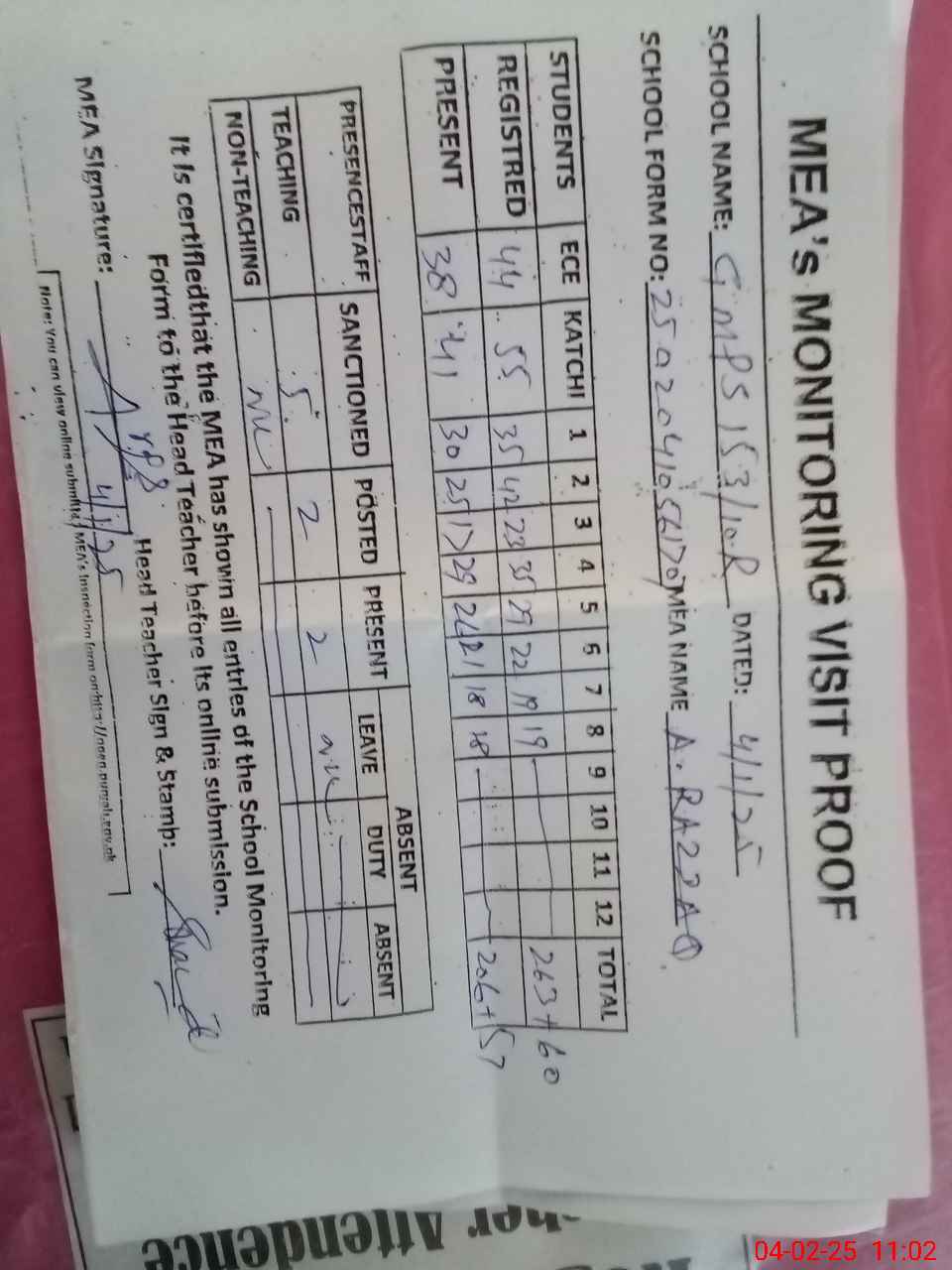 | Attendance Register | Head Teacher | MEA with School | Visit Proof |