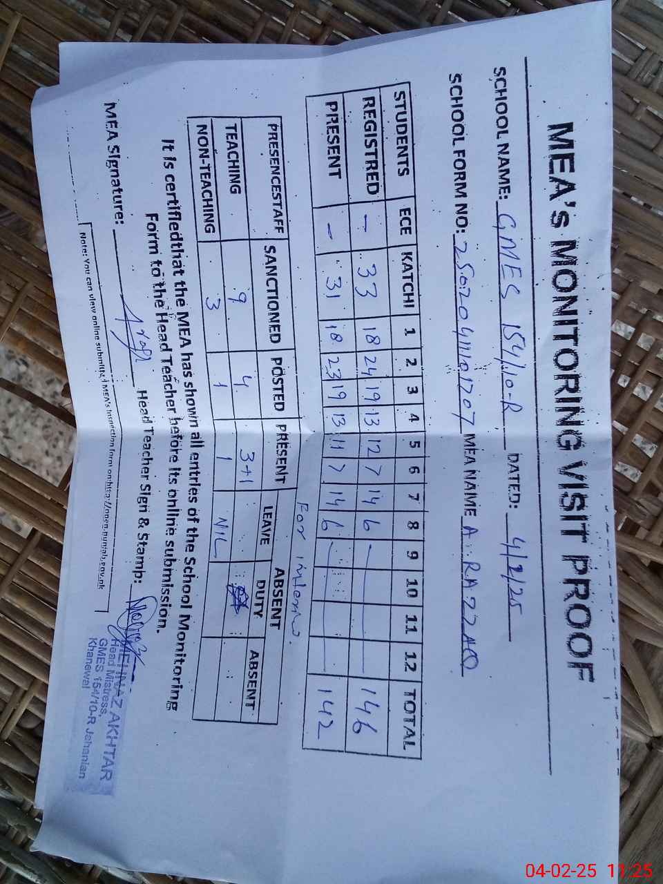 | Attendance Register | Head Teacher | MEA with School | Visit Proof |