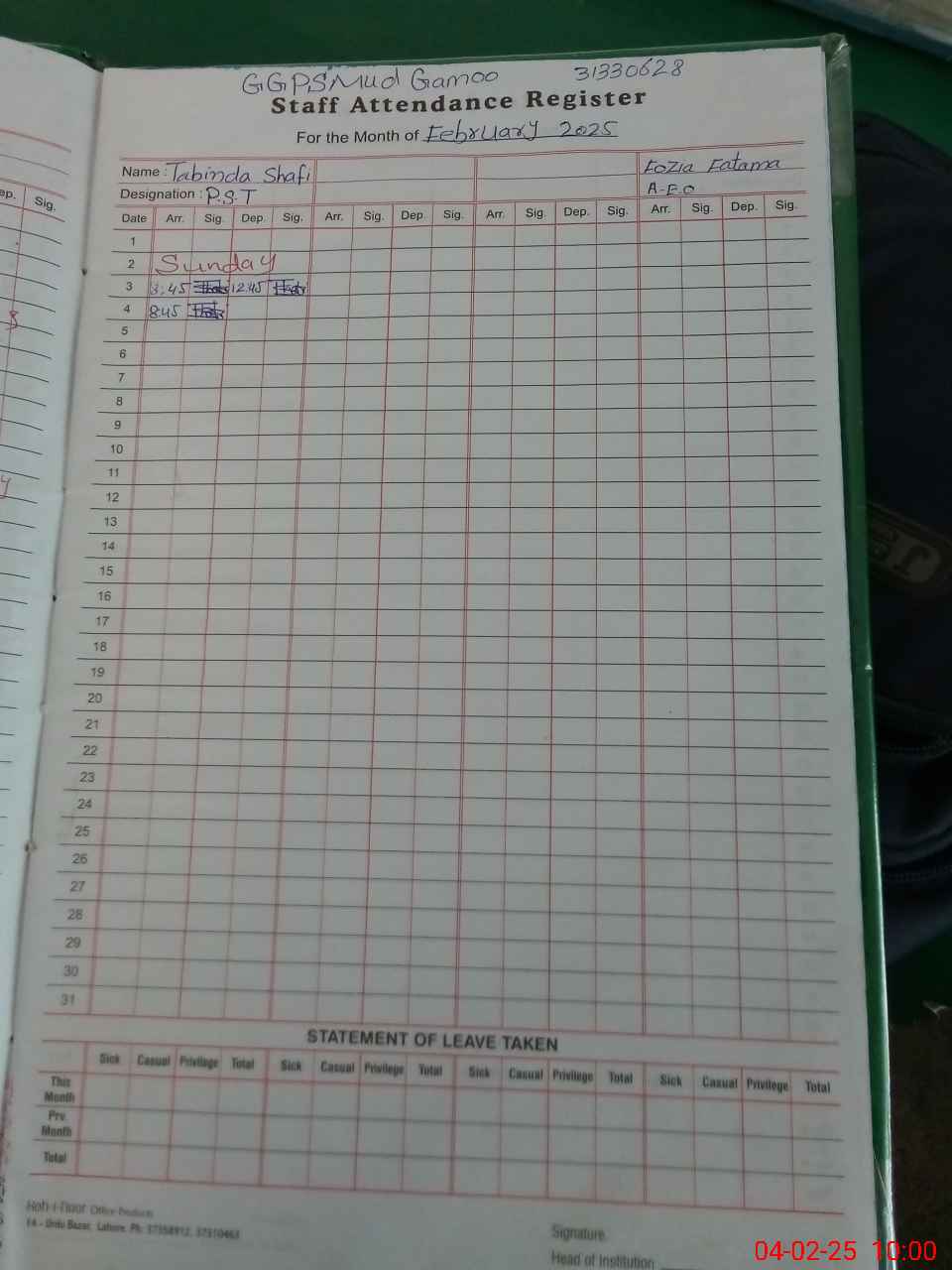| Name: Ta**** Sh**** Designation: (School Headmaster's/Headmistress's) PST/PTC/JV Phone/Cell Number: 03**** |