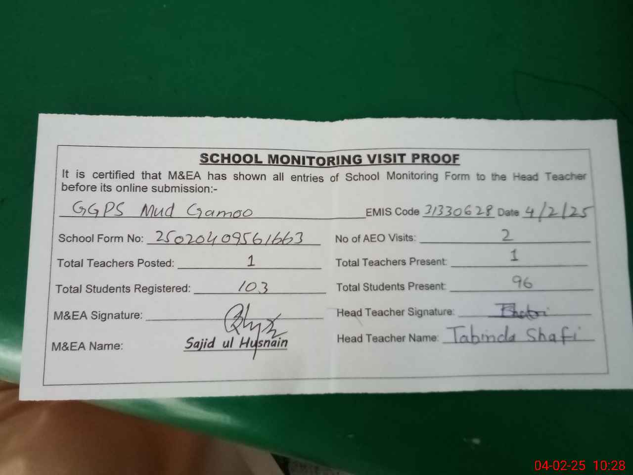 | Attendance Register | Head Teacher | MEA with School | Visit Proof |
