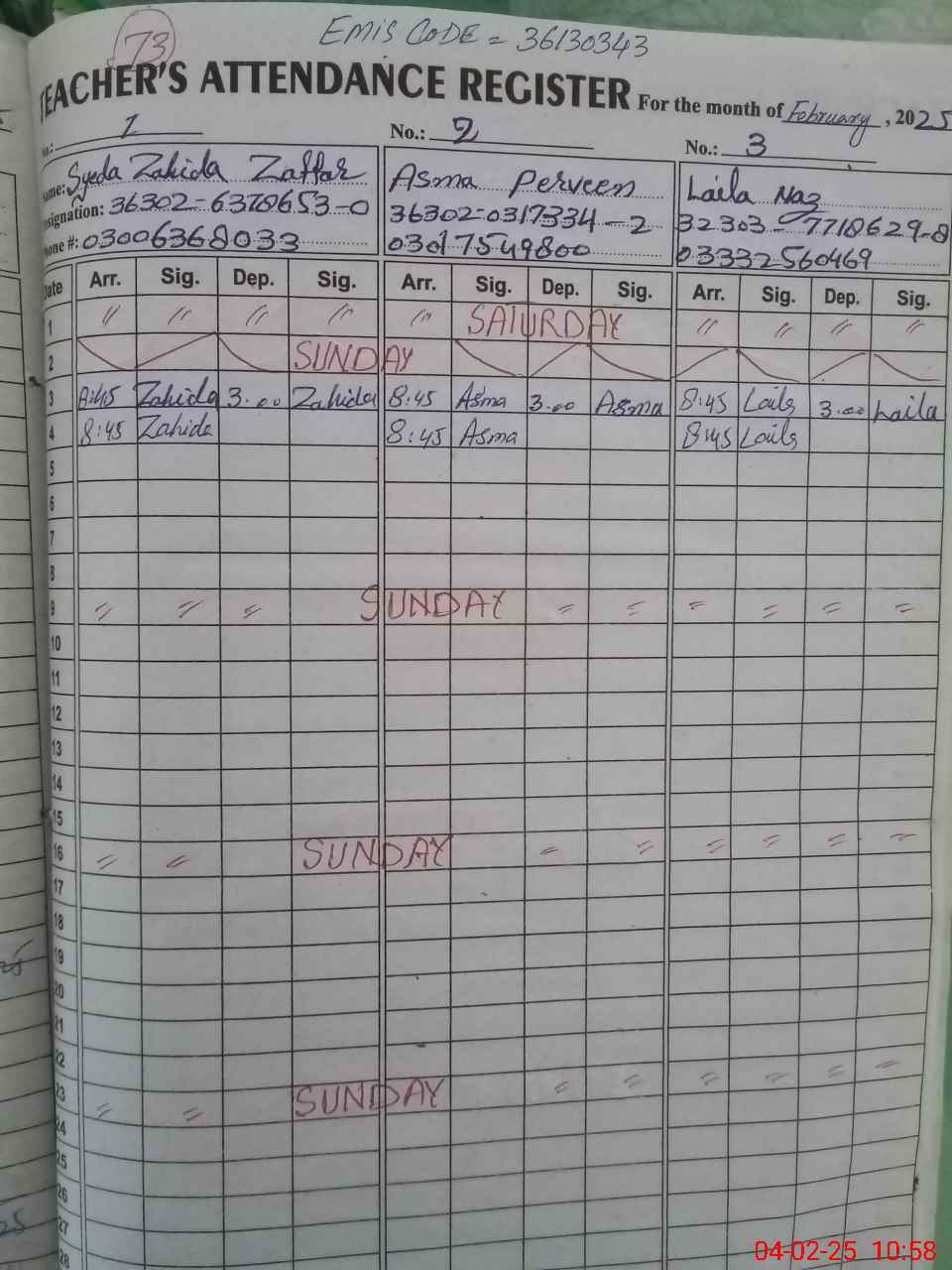 | Name: ZA**** ZA**** Designation: (School Headmaster's/Headmistress's) INCHARGE Phone/Cell Number: 03**** |