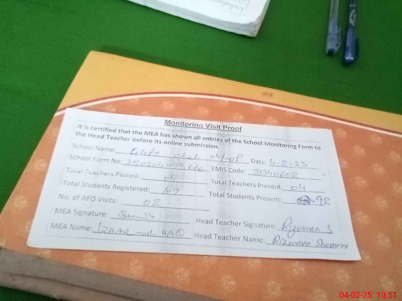 | Attendance Register | Head Teacher | MEA with School | Visit Proof |