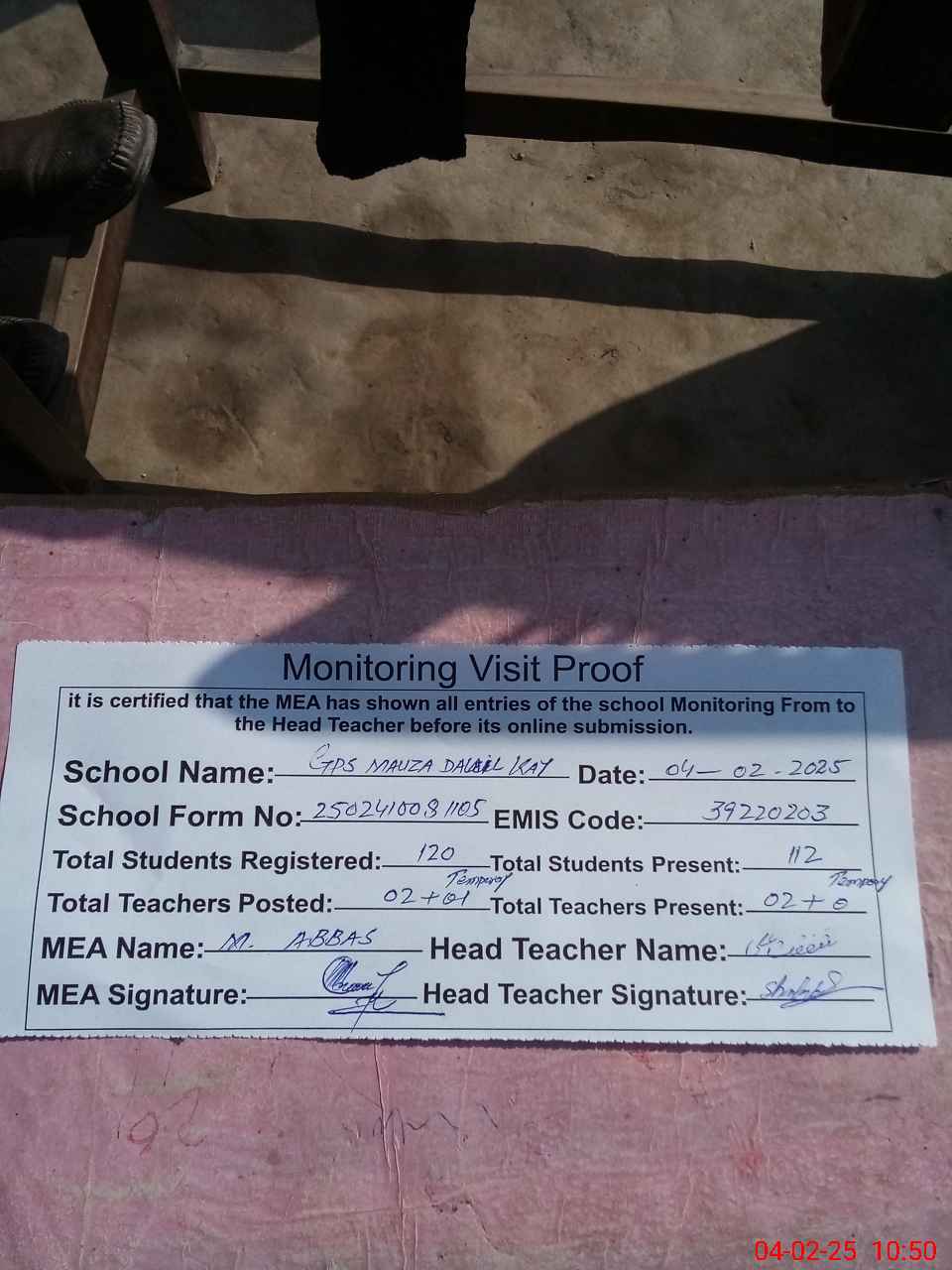 | Attendance Register | Head Teacher | MEA with School | Visit Proof |