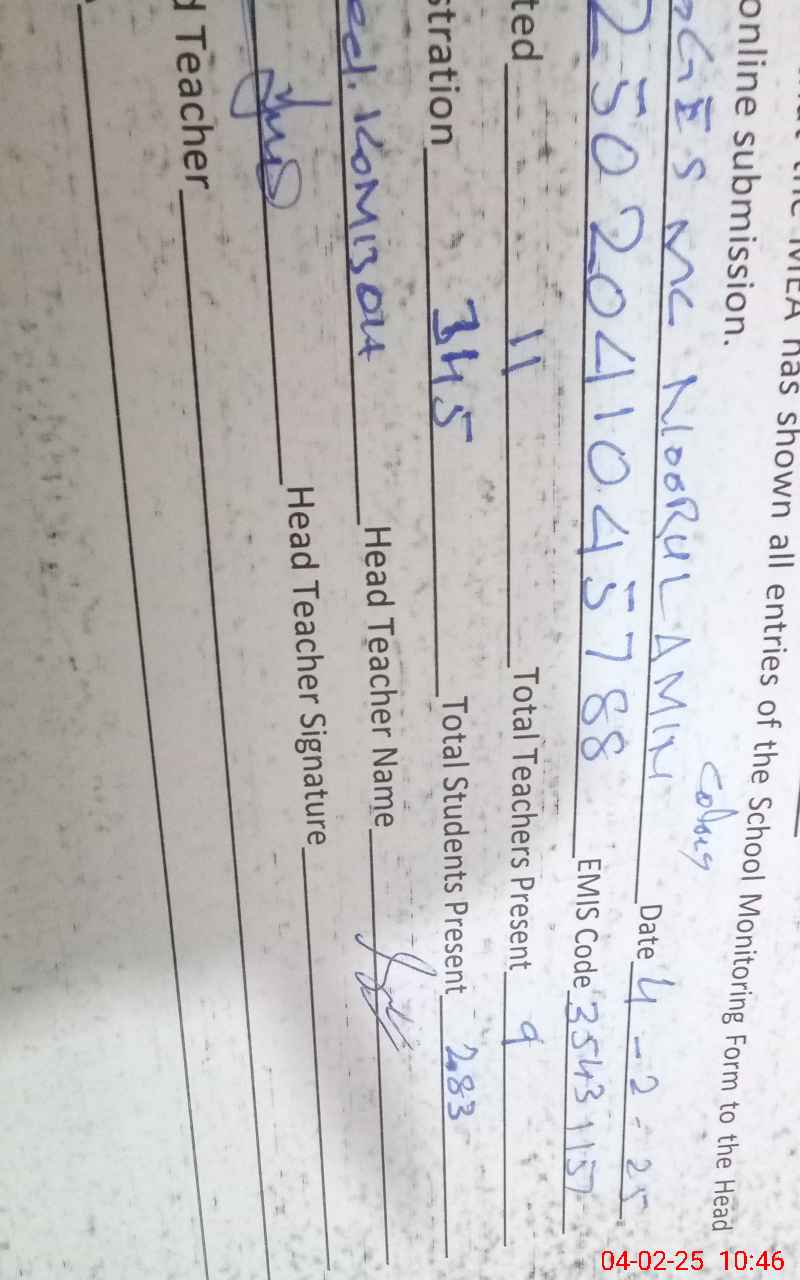 | Attendance Register | Head Teacher | MEA with School | Visit Proof |