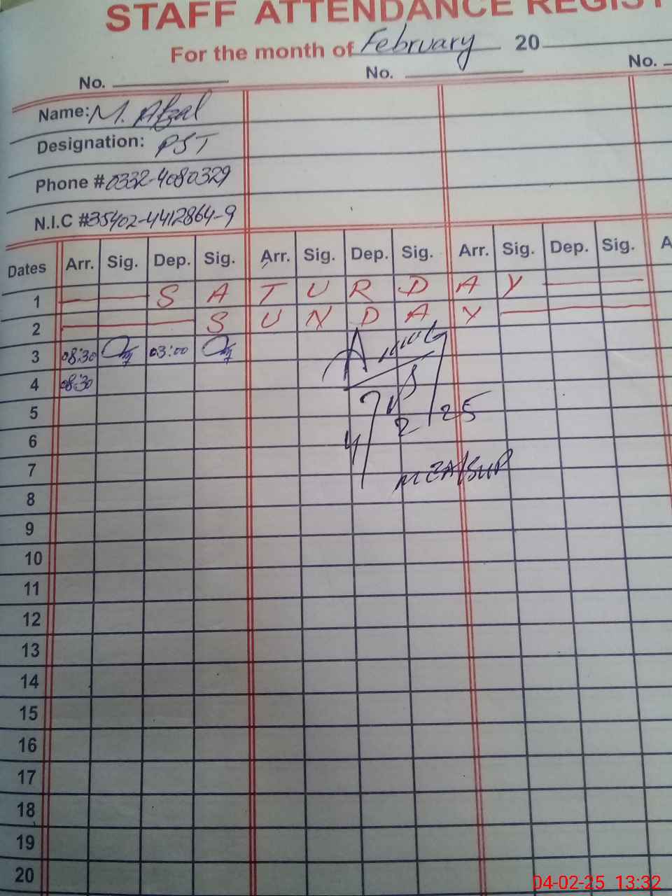 | CNIC | Full Name | Designation | R/C | Absence During Last Calender Month |